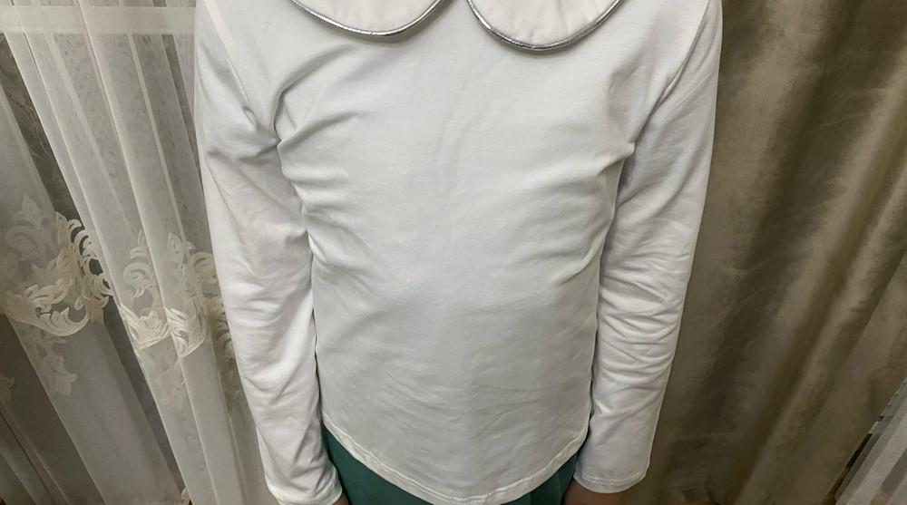 Дизайн модели дополнен кантом с серебряным люрексом по краю воротника, который придаёт лёгкий блеск и делает блузку более нарядной. Классический воротник сохраняет строгий стиль, соответствующий школьному дресс-коду, а застёжка на пуговицу сзади облегчает надевание и добавляет аккуратный декоративный элемент в спинке изделия.